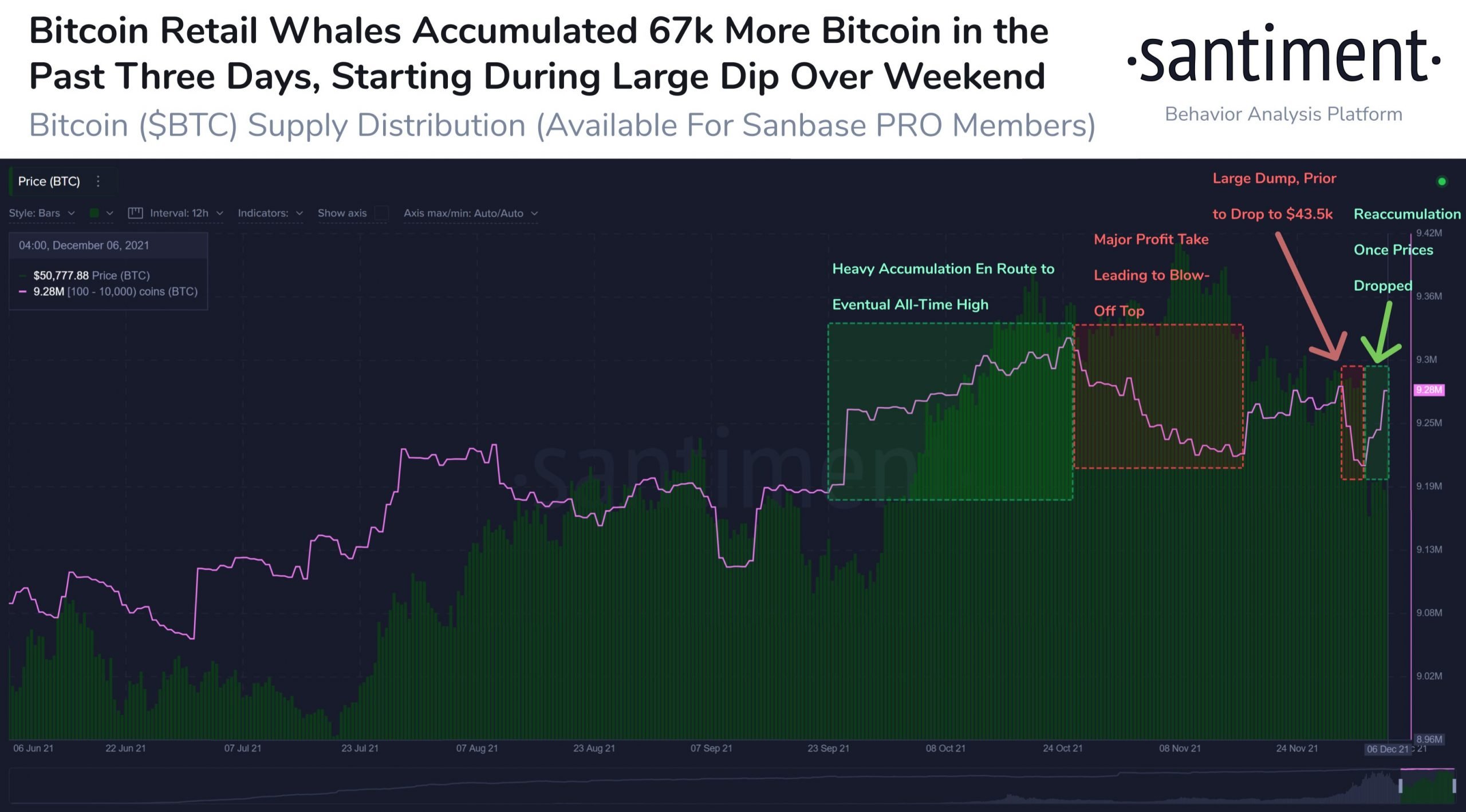 Công ty Santiment cho rằng: “Bitcoin trở lại với ngưỡng 50,1.000$ vào ngày 6/12, các cá voi đã nắm bắt được thời cơ. Mở màn với việc bán phá giá ở mức 43,5.000$ cho các địa chỉ có từ 100-10.000 BTC, 67.000 BTC khác đã được tích lũy sau đợt xả coin trước khi giá bị giảm một nửa”.